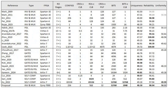 RO-based PUFs are the ones that are most widely reported in the literature [27,28,29,30,31,32,33,34,35,36,37,38,39,40,41,42,43,44,45,46,47,48,49,50,51,52,53,54,55,56,57,58,59], especially that related to field-programmable gate arrays (FPGAs), not only because of their special suitability to be implemented on these devices but also because they generally present acceptably good uniqueness and reliability values. However, its main drawback lies in the need to use a large amount of resources to achieve in its output the high number of bits required by the current cryptographic algorithms. In recent years, there have been numerous proposals that take advantage of different types of configurability to increase the number of ROs in a PUF. This increase makes it possible to use some selection mechanism to choose the most appropriate ROs in order to improve the reliability of the PUF while allowing the hardware efficiency of the circuit to be augmented by providing a greater number of bits in its output.