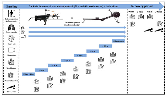 To analyze blood lactate concentrations, capillary blood samples (5 μL) were collected from the earlobe at rest, between the steps, immediately after the test, and at the 3rd and 5th min of the recovery, using a Lactate Pro 2 analyzer (Arkay, Inc., Kyoto, Japan) [3,21]. The lactate-power curve was used to assess the anaerobic threshold using the least square method [20,22], allowing determination of the following exercise intensity domains: (i) low and moderate intensities, corresponding to the two steps below and the anaerobic threshold (respectively); (ii) the heavy and severe intensities, matching the steps below and where maximal oxygen uptake was elicited (respectively); and (iii) the extreme intensity, allocated to the 1 min step maximum exertion at the end of the protocol [21,23]. A self-reported rating of perceived exertion was assessed at baseline and at the 30th min of the recovery using the 6 to 20 Borg scale [18,21,24]. A prone plank exercise was used to characterize the muscle function responses at baseline and at 5th and 30th min of the recovery by measuring the time the position was maintained using a chronometer (Seiko, Tokyo, Japan). Rowers had their body weight supported by toes and forearms, with the test ending when they could no longer keep a straight back, lowering the hips [24,25].