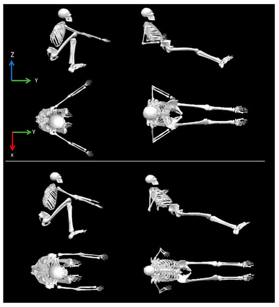 Kinematic data were obtained using eight video cameras (Miqus, Qualisys AB, Göteborg, Sweden), operating at a 100 Hz sampling rate and a 720p resolution, with a calibration error of less than 0.50 mm [21]. Full-body markerless kinematics with 6° of freedom were obtained using the Theia Markerless (Theia Markerless, Kingston, ON, Canada) software v2024.03.3 [26] and a 60 s recording (from 60 to 120 s) was performed for each exercise step, while the 1 min final step was recorded entirely. Kinematic analysis of the markerless model was performed in Visual 3D software v2024.06.2 (HAS-Motion, Kingston, ON, Canada) [27] and variables were calculated using a custom-made pipeline. To allow a comparison between ergometers, a midpoint between the hands’ center of mass was created to represent a common handle, because the Biorower allows independent movement of both hands (unlike the Concept2, where both hands hold a single handle).