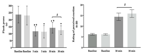Mean and SD values of the prone plank performance and rating of perceived exertion (left and right panels) for the Biorower and Concept2 rowing ergometers (dark and light grey). *, + and # differences from baseline, 5 min, and 30 min (p < 0.05).