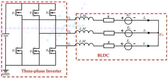 For the realization of the motor control algorithm, according to the motor parameter characteristic hypothesis and model analysis of BLDC in reference [16], the simplified mathematical equation of the motor is established in this paper. The simplified equivalent circuit diagram of BLDC is shown in Figure 3. Through the analysis and prediction of the running state of the motor, different control principles can be designed, and the corresponding photoelectric sensor and sliding mode controller are used to obtain the speed feedback, respectively, so as to design the appropriate control strategy to achieve the desired speed regulation effect. The voltage equation of BLDC is as follows: