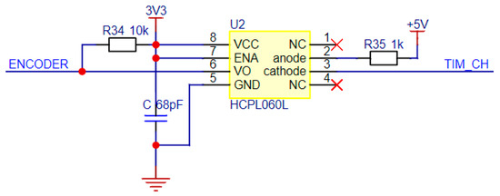 The interface circuit diagram of the photoelectric encoder is shown in Figure 5. HCPL060L is a photoelectric isolation device. The pulse signal generated by the photoelectric encoder enters the interface circuit and is then electrically isolated by HCPL060L. The isolated signal is processed after being captured by the timer of the single-chip microcomputer. This design can effectively prevent the influence of noise and interference in the encoder signal on STM32 and can improve the stability and reliability of the system.