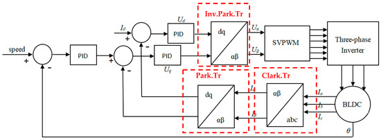 FOC aims to reduce the torque ripple and noise of the motor by accurately controlling the size and direction of the magnetic field, and can quickly respond to speed, rotor position, and torque commands, thereby achieving accurate control of torque and speed. As shown in Figure 6, the realization of the FOC algorithm is based on the Clark and Park coordinate transformation [18]. The FOC algorithm converts the three-phase stationary coordinate system (abc) into a two-phase rotating coordinate system (dq), which simplifies the control model and serves as the input to the PI controller. The Clark transform equation in the study is