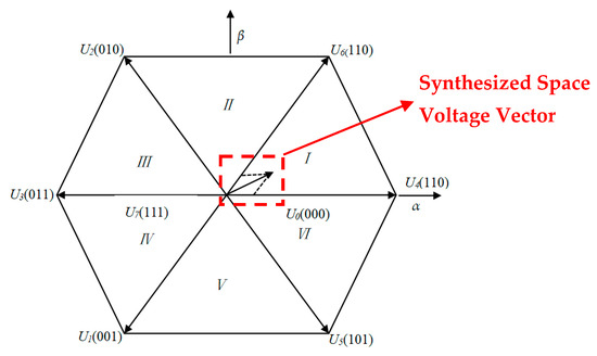 The SVPWM algorithm [19] controls the switching state of the three-phase inverter and then generates a voltage or current output that is close to the ideal sinusoidal waveform. The SVPWM algorithm considers the inverter and the motor as a whole. By controlling the switching sequence of the inverter, the output voltage space vector achieves an ideal circular trajectory.