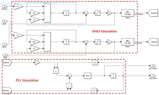 In order to obtain a better speed output response curve, SMO is used to estimate the speed and position of the motor rotor at high speed, and the estimated value is used to replace the speed and position value detected by the photoelectric encoder in the original system. The sliding mode observer is a nonlinear observer. Compared with other state observers, it has excellent robustness based on high dynamic response capability [24]. SMO uses the sign function to replace the actual value of the deviation, which not only effectively copes with external interference, but also effectively improves the stability of the control system. Figure 11 shows the SMO simulation module [25].