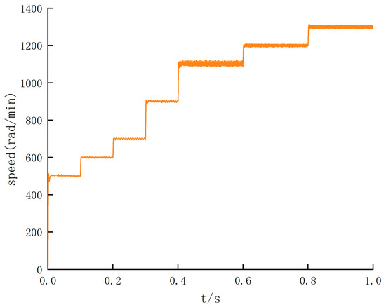 In order to study the speed defect of photoelectric encoder detection, the photoelectric encoder is used to measure the speed. Under the premise of not exceeding the maximum speed set in Table 2, under the premise of not exceeding the maximum speed set in Table 2, BLDC operates at variable speed within the speed stages of 500, 600, 700, 900, 1100, 1200, and 1300 rad/min, respectively. The simulation results are shown in Figure 12.