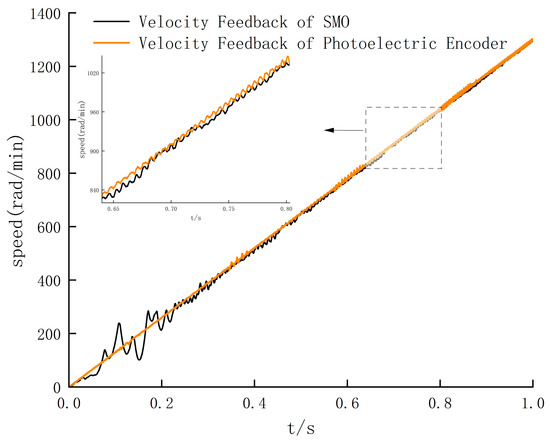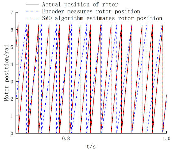 According to the observation angle of the motor in the high-speed range in Figure 16, it can be seen that there is a deviation between the rotor phase measured by the photoelectric encoder and the actual value, which will cause an increase in chattering and a decrease in control accuracy. However, there is no phase error under the SMO algorithm, which verifies the feasibility [26] of the SMO control strategy within the high-speed range.