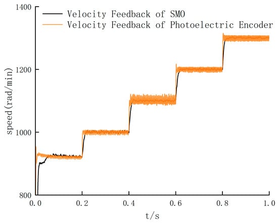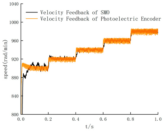 The simulation results in Figure 12 and Figure 13 show that there is no overshoot at the time of speed switching, and the robustness of the system is verified. And it can be explained that under the premise of the feedback speed of the photoelectric encoder, the AGV speed output is stable when driving at low speed. Figure 13 shows that when the BLDC speed exceeds 900 rad/min, the output waveform of the speed feedback of the encoder is seriously jittered. Still, on the basis of the SMO algorithm, the output waveform of the speed feedback is stable.