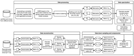 The proposed method is presented in Figure 1, which outlines the overall process. The study encompasses seven steps: (1) preprocessing point cloud data by simplification, removing outliers, and registering point clouds captured from different angles; (2) local clustering analysis to determine the number of clusters based on the observation distances GMM and density peaks; (3) dividing the complete point cloud data into k clusters using the k-means algorithm; (4) reshaping each dimension vector of subcluster data into an matrix; (5) converting each reshaped matrix into a sparse one using a specific wavelet basis; (6) generating the compressed matrix through partial Fourier matrix downsampling; and (7) reconstructing the sparse signal using the ADMM-BP algorithm.
