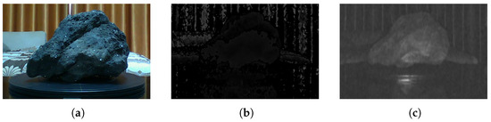 This study utilized an Intel L515 LiDAR camera (Intel, Inc., Chandler, AZ, USA). to collect point cloud data from rock fragment surfaces. This camera collects the original data based on video streaming technology, with a deep measurement range of 0.6∼9 m and a maximum frame frequency of 30 f/s. Each frame comprises deep distances, a high-definition RGB image, a deep image, and an infra-image. Figure 2 clearly illustrates the three types of images; Figure 2a shows a high-definition RGB image, Figure 2b shows a depth image, and Figure 2c shows an infra image.