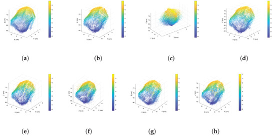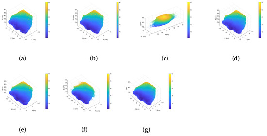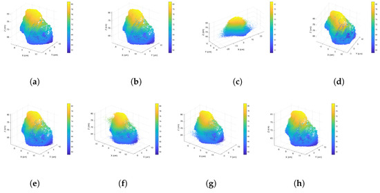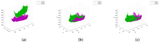 To merge partial point clouds into a complete point cloud, this study utilized the Four-Point Congruent Set (4PCS) algorithm [26] to implement coarse registration and the Iterative Closest Point (ICP) algorithm [27] for fine registration. Figure 5 shows partial point cloud states before and after registration; Figure 5a shows the original data, Figure 5b shows the coarse registered data, and Figure 5c shows the fine registered data.