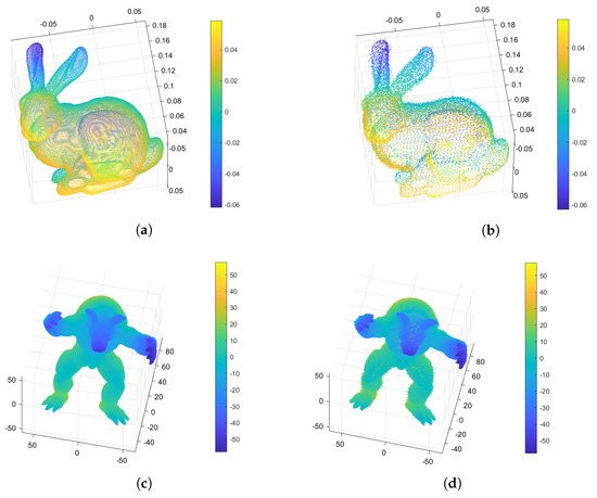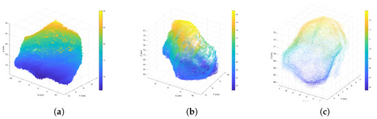 As examples, in this study three scales of rock fragment samples were used for analysis and experimentation: , , and . Figure 6 shows their complete point clouds.