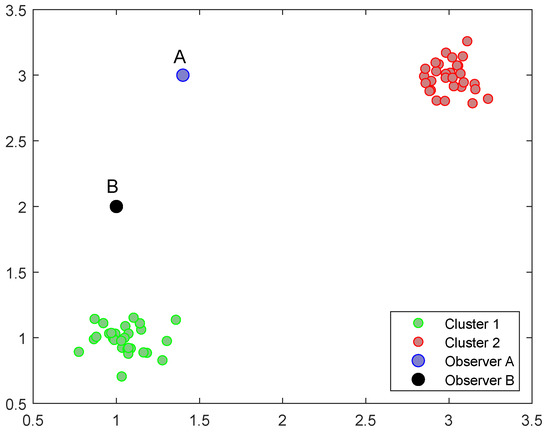 Our approach iteratively estimates () GMMs using the EM algorithm based on observation distances. It selects the GMM with the minimum AIC (Akaike information criterion) value [28] as the optimal solution, treating the Gaussian component number of the optimal GMM as the candidate cluster number. However, the optimal GMM is sensitive to the observer’s location. Figure 8 shows different GMMs for different observers. Observer A finds a one-component GMM in the middle of two datasets, while Observer B finds a two-component GMM.