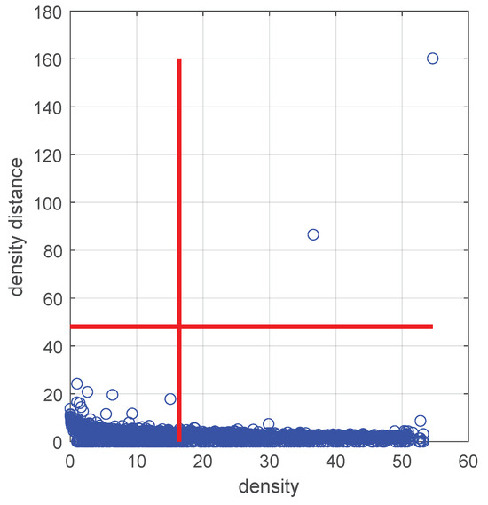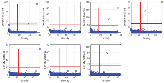 Candidate cluster centers are points with higher density and density distance. We can roughly set the density distance threshold to 30%, as shown in the red line of Figure 9. Those points in the top right-hand quadrant are candidate cluster centers. In this way, candidate cluster centers accumulate in all components of the optimal GMM.