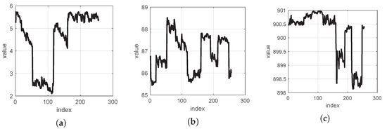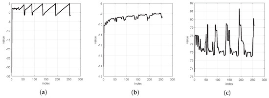 Mechanical LiDAR signal shapes of the outcrop point cloud data: (a) shape of the X-dimensional signal, (b) shape of the Y-dimensional signal, and (c) shape of the Z-dimensional signal.