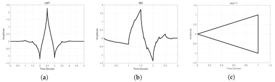 Waveforms of the three wavelets: (a) waveform of the coif1 wavelet, (b) waveform of the db2 wavelet, and (c) waveform of the bior1.1 wavelet.