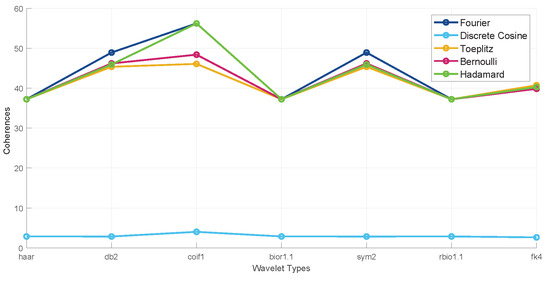 Comparison of coherence values generated by various measurement matrices and wavelet bases.