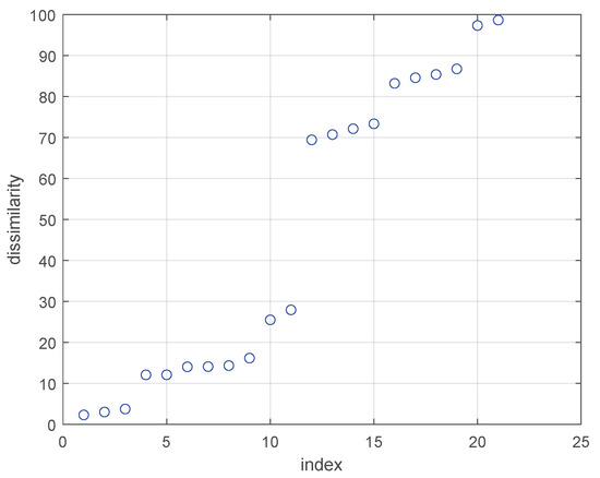 Certain redundant candidate cluster centers, such as identical and closer points, must be removed; given m candidate cluster centers, the dissimilarity is the Euclidean distance between any two candidate cluster centers. In contrast to removing points with a threshold, we remove redundant candidate cluster centers with inflection points [31] in the dissimilarities sequence. The inflection points method is more interpretable. It can solve the inflection points with a second-order difference of zero, then merge all points with dissimilarity smaller than the inflection point. Finally, the merged number of candidate cluster centers is the estimated number of clusters, i.e., the k parameter.