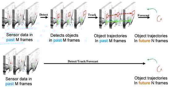 - Peri, N.; Luiten, J.; Li, M.; Ošep, A.; Leal-Taixé, L.; Ramanan, D. Forecasting from lidar via future object detection. In Proceedings of the IEEE/CVF Conference on Computer Vision and Pattern Recognition, New Orleans, LA, USA, 18–24 June 2022; pp. 17202–17211. [Google Scholar]