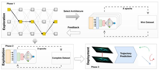 TrajectoryNAS is a one-stage trajectory prediction [,]. The model takes a sequence of Lidar data captured from the scene, which integrates a robust 3D backbone with cutting-edge neural architecture search (NAS) to refine map-view feature extraction from LiDAR point clouds. This innovative architecture further evolves by automating the design of multi-2D CNN detection heads, specifically tailored for future object detection and trajectory prediction. By detecting objects across multiple future timesteps and accurately projecting their movements back to the current moment, TrajectoryNAS stands out for its precision in trajectory prediction. This system not only anticipates the dynamic positioning of objects but also adjusts its computational strategies in real-time, ensuring a high degree of accuracy and efficiency in processing. The inclusion of NAS allows for continuous improvement of the detection and prediction heads, making TrajectoryNAS a highly adaptive and forward-thinking solution in the realm of autonomous navigation and surveillance technologies. TrajectoryNAS employs a hybrid optimization strategy to minimize optimization costs. The process is divided into two phases. The first phase, called exploration, involves the algorithm exploring various neural architecture designs to identify the optimal design. This phase is time-consuming as the algorithm must evaluate a wide range of parameters within the search space elaborated in Section 3.1. During the exploration phase, it is crucial to establish a comparative accuracy metric that can evaluate different architectures and determine the relative optimal design. To reduce processing time, the exploration phase utilizes a subset of the Nuscenes dataset [], which contains significantly less data but maintains a distribution similar to the full dataset. To ensure that the selected model performs efficiently on the complete dataset, we use the full dataset in the second phase, known as exploitation, where we report the final accuracy of the designed model.