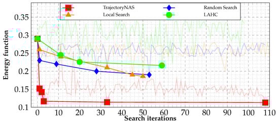 Figure 4 presents a detailed comparison of the energy function reduction (as defined in Equation (1)) during the search process employed by the TrajectoryNAS algorithm against those of random search and local search methods. This comparative analysis clearly demonstrates the limitations of both local search and random search techniques in effectively identifying the most optimal solution. Specifically, the best outcome identified through Random Search, characterized by an energy value of e = 0.19 as per Equation (1), was achieved in iteration 52. Similarly, Local Search’s most effective solution registered an energy value of e = 0.186, and this result was obtained in iteration 50.