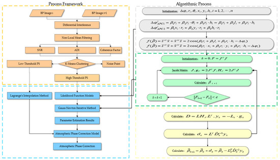 The three most basic correction methods for APS caused by changes in atmospheric conditions are ground control point correction, meteorological data correction, and parametric modeling methods. The ground reference point correction method is a correction method that utilizes the spatial interpolation of the atmospheric phase values of the reference points in the scene to obtain the atmospheric phase values at all points [14,15]. The meteorological data correction method involves establishing a meteorological station within the observation scene and using meteorological data (temperature, humidity, and atmospheric pressure) to quantitatively estimate the atmospheric phase based on the atmospheric-refractive index model [16]. Meanwhile, in a new study, researchers simulate the relevant meteorological parameters using the ensemble scheme of the stochastic physic perturbation tendency based on the weather research forecasting model [17]. The parametric modeling method is a correction method that models the atmospheric phase and then estimates the model parameters with the help of the permanent scatterer (PS) technique to obtain the atmospheric phase values at all PS points [18]. Under ideal conditions, where the atmosphere varies uniformly in space, the atmospheric phase can be modeled as a component that varies linearly with the slope distance [19]. However, this linear relationship is sometimes affected by phase ramps such as orbital errors, tidal loading, etc. There is a new approach to estimate the transfer function of vertical stratification phase delays and the transfer function of phase ramps [20]. Focusing on stratified atmospheric delay correction in the small-amplitude displacement field of small-to-moderate earthquakes, researchers developed a Simple-Stratification-Correction approach based on the empirical phase-elevation relationship and spatial properties of the troposphere, via an equal-size window segmentation [21].