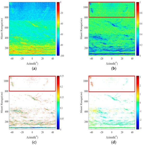 Radar data processing results. (a–d) The radar imaging map, amplitude divergence index map, PS amplitude divergence index map, and PS differential interferogram, respectively.