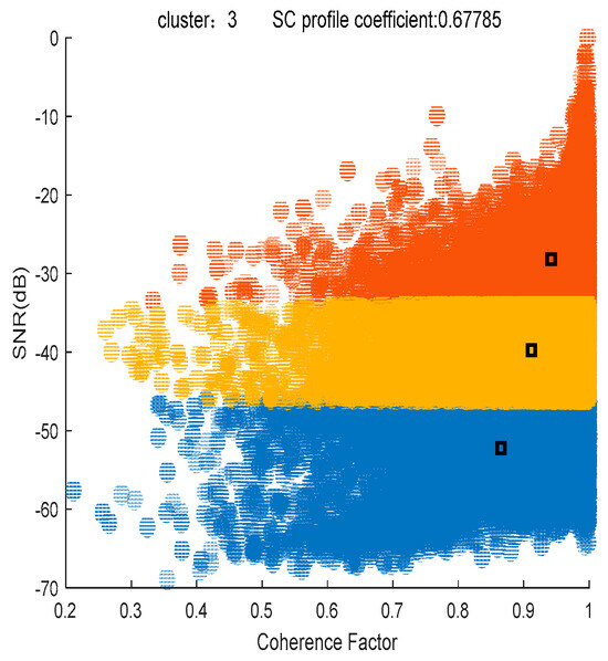 Based on the classification criteria of the SNR and coherence factor, the results of the K-means clustering algorithm are shown in Figure 4, where the SC profile coefficient (ranging from 0 to 1) is 0.67785, indicating a good clustering effect. The three colors indicate that the clustering results are classified into three categories. Red, yellow and blue indicate noise points, low-threshold PSs and high-threshold PSs, respectively. An SNR threshold of −39 dB and a coherence factor threshold of 0.91 are adaptively calculated by the K-means clustering algorithm, and 20,197 high-quality PSs are selected by the threshold. The magnitude deviation index plot of the high-quality PSs is shown in Figure 5a, where the red box represents the area where the noise points have been significantly eliminated after processing, and Figure 3c shows that some of the noise points are eliminated. Figure 5b shows the differential interferogram of high-quality PSs, where the black circle indicates that there is a significant phase error in the region after differential interference.