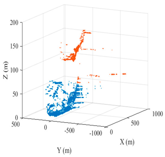 According to the selected high-quality PSs and the 1,414,930 point clouds from the TLS, the K nearest neighbor (KNN) algorithm is used for alignment, and the DEM values of the aligned point clouds are assigned to the PS. Afterward, Lagrange interpolation is used to calculate the DEM values of the remaining high-quality PSs. The results after alignment interpolation are shown in Figure 6. The K-means clustering algorithm is again utilized to divide the observation region into proximal and distal regions (shown in Figure 7). On this basis, multiple differential interferograms are obtained by differential interferometry using a 0 cm baseline with the previous image as the main image and the latter image as the auxiliary image. Figure 8 shows differential interferograms of the proximal and distal ends of the observation region.