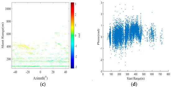 Differential interference result plots. (a,b) The differential interferometric phase and scatter plots at the far end of the 0 cm baseline, respectively. (c,d) The differential interference phase and scatter plots at the proximal end of the 0 cm baseline.