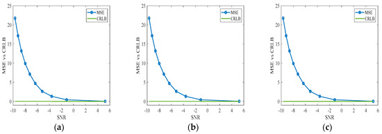 SNR-MSE plots. (a–c) The results of comparing the estimated MSE with CRLB for the β1, β2 and β3 parameters in the proximal correction model of the Monte Carlo experiment.