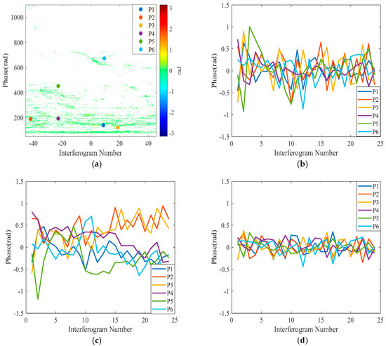 Differential interferometric phase timing diagram. The position of six reference points in the monitoring area are marked in (a–d). They are the differential interferometric phase timing diagrams for pre-correction, the conventional method, and the method of this paper, respectively.