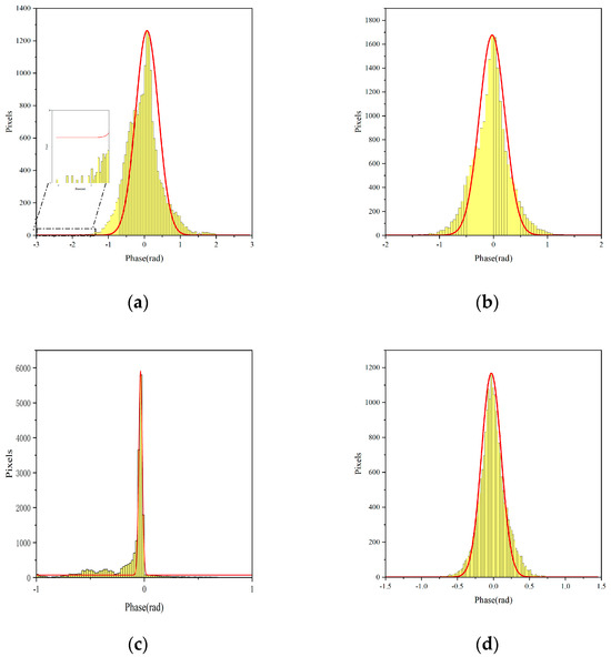 Histogram of frequency distribution. (a–d) The histograms of frequency distributions for pre-correction, LSM, the Newton method and this paper’s methods, respectively.