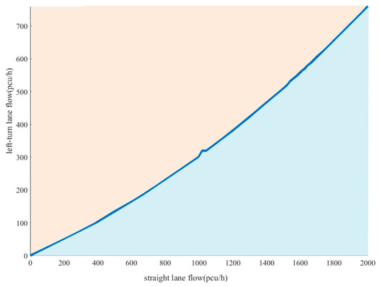 The curve where the two planes intersect to obtain the threshold curve for the single approach variable guide lane functional attribute is shown in Figure 3. In practice, based on the real-time straight and left-turn flows and the threshold curve, it is possible to determine whether the variable guide lane functional properties need to be changed. When the combination of straight and left-turn traffic is above the threshold curve, the variable guideway function needs to be changed. When it is below the threshold curve, it remains unchanged. Representative critical values in the threshold curve were selected, and the results are shown in Table 2.