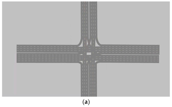 This paper chooses the Huangke intersection in the Hefei Demonstration Area as the research object. The intersection has a large traffic flow, and at the same time, the shape of the intersection is relatively regular, which is suitable for the setting of VALs. The intersection’s layout is shown in Figure 1. Variable guidance lane technology can change the direction of the vehicle in real-time according to the traffic turning demand; that is, the lane has a non-fixed vehicle movement or turning function. Variable guideway lanes are flexible and differ from conventional lanes in that they contain several diagonal lines, commonly referred to as “sawtooth” markings. The intersection has five lanes in the east approach direction, with motor and non-motor vehicle separation. The channelization is designed from inside out with left-turn lanes, variable guide lanes, straight lanes, and right-turn lanes, in that order. Right-turn vehicles are not considered, and the initial functional attributes of the variable approach lane are straight. The lane settings at the intersections are all set up according to Figure 1a, which shows the real existing site conditions. The data are available on the OpenITS website (http://www.openits.cn/openData2/710.jhtml, accessed on 19 November 2021).