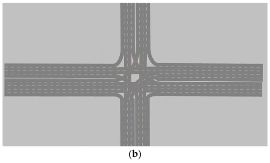 Layout of the intersection. (a) Variable guided lanes without lane change function. (b) Variable guided lanes with lane change function.