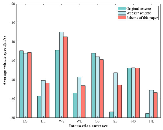 A comparison of the average vehicle speeds for each scheme is shown in Figure 5. In Figure 4, the east approach straight is noted as ES, the east approach left turn is noted as EL, and the rest is similar.