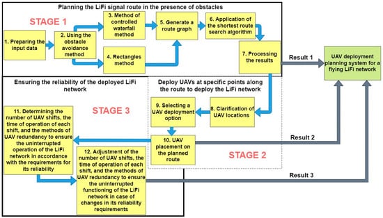 To solve the formulated scientific and applied tasks, a planning scheme for deploying a flying LiFi network based on UAVs in a production facility with obstacles was developed (Figure 1), according to which such planning takes place in three stages.