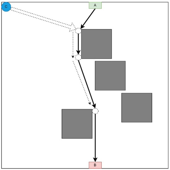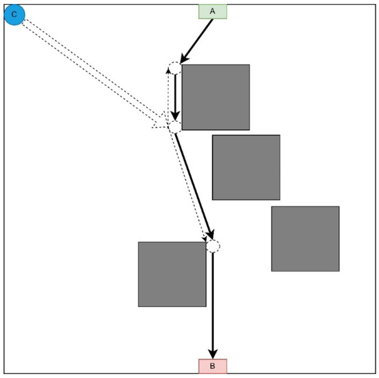 This strategy involves moving each UAV to the first point of the LiFi route and further deploying the network within it (Figure 2). This strategy may be in demand if there are no obstacles on the UAV route from the depot (point C) to the first LiFi point of the route and a significant number of obstacles on the UAV routes to its other points (it is necessary to lay additional routes to bypass these obstacles).