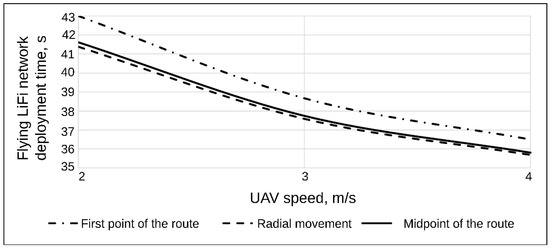 Thus, with a strategy of the first point, a flying LiFi network of five UAVs at a UAV speed of 2 m/s can be deployed in 41.38 s, with a speed of 3 m/s in 38 s, and with a speed of 4 m/s, it can be deployed in 36.6 s.