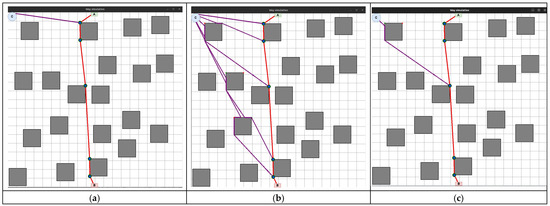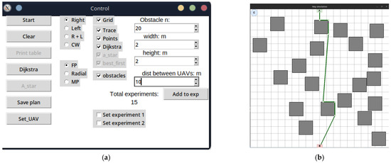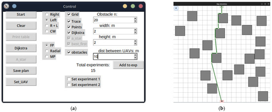 UAV motion and path planning. The work of [5] describes the development and comparison of two UAV motion planning algorithms with the possibility and impossibility of contact with the environment. The authors propose two motion planning schemes that reduce the bound-aware reachable configuration space, deliberately plan (and weaken) the points of contact of the bound with the environment, and provide an equivalent reachable configuration space as the unbound counterpart. The authors emphasise that their approach allows tethered aircraft to be used in confined and cluttered environments with obstacles instead of ideal free space while retaining the benefits of tethering. The authors of [6] offer a set of algorithms for planning the UAV flight path indoors, optimised for difficult conditions. Firstly, an algorithm for optimised indoor air space grid modelling based on a grid of geographic coordinates division with one-dimensional integral coding on a 2ⁿ-tree in three dimensions is proposed to reduce the computational complexity of modelling three-dimensional air space in the room using spatial subdivisions. The authors of [7] provide an overview of proposals for the architecture of obstacle avoidance and UAVs. Different approaches are usually considered, including sensor-based, planning, and control approaches. Various network architectures, such as peer-to-peer, centralised, and hybrid networks, are also discussed. The authors conclude that obstacle avoidance algorithms and perfect network architecture are the two most important aspects of developing reliable and efficient UAVs. They point out that there are many different approaches to obstacle avoidance and network architecture, and the choice of the appropriate approach depends on the specific application of the UAV. Recently, more and more attention has been paid to solving problems related to obstacle avoidance and route planning for ground and air robots. For example, the authors of [8] apply the Delaunay triangulation algorithm and the improved A* algorithm to analyse complex obstacles and generate Voronoi points as priority nodes for path finding to improve the efficiency of mobile robot trajectory planning. First of all, the authors build a triangular grid based on a set of obstacles and nodal points. The corner points are then transformed into a graph used in the improved A* algorithm to find the shortest path between the start and endpoints. First of all, it should be noted that the algorithm is resistant to changes and simple to implement. However, the algorithm may be less efficient in austere environments, lose efficiency in dynamic environments where changes occur rapidly, and be computationally expensive for large environments. In the works of [9,10], a new approach to dynamic path planning for mobile robots is presented based on a hybrid solution of an ant colony and dynamic windows. The ant colony algorithm is a biologically inspired search algorithm that mimics the foraging behaviour of ants. The dynamic window algorithm is a real-time path planning algorithm that considers the robot’s current state and dynamic changes in the environment. The proposed approach combines the advantages of the ant colony algorithm and the dynamic window algorithm to create a more efficient and reliable obstacle avoidance route planning algorithm. The ant colony algorithm finds a global path to the goal, and the dynamic window algorithm generates a local route that the aerial robot or the ground robot can follow in real time. The authors suggest possible algorithm applications, such as warehouse navigation, autonomous driving, courier robots, and scout robots. In [11], the authors proposed a method based on deep learning, a ray tracing algorithm, a waiting rule, and a fast-explorable random tree. The proposed approach uses a neural network to train a model that can predict safe routes for indoor robots. The neural network is trained on a dataset consisting of images of the environment and information about obstacles. The authors consider the robot navigation algorithm in offices, hospitals, etc. The article of [12] describes a new approach to obstacle avoidance using the Floyd–Warshall differential evolution algorithm. It allows the shortest paths between all pairs of points on the graph to be found. The graph represents the environment in which the UAV must avoid obstacles. Firstly, a graph of the environment is built using UAV sensors. After that, the evolutionary algorithm of Floyd–Warshall differential evolution is used to find the shortest route from the current position of the UAV to the target while avoiding obstacles. The study of [13] considers the issue of designing a quadcopter trajectory in the shortest time through a series of defined waypoints, using all the advantages of quadcopter dynamics. Firstly, a graph of the environment is built using data from the sensors of the quadcopter. The A* algorithm is then used to find the shortest route from the current position of the quadcopter to the target while avoiding obstacles. The authors of [14] propose an approach for planning a UAV flight route that bypasses obstacles and connects the start point to the endpoint in a closed space. The approach creates an optimal route using A* algorithms and hill climbing with a delay. The work of [15] considers the issue of planning UAV routes indoors. The research demonstrates the development of an improved method for planning probabilistic roadmaps for safe indoor flights based on the assumption of a quadcopter UAV model. Experiments have confirmed that the method ensures safe indoor UAV flights while significantly increasing computational efficiency. To maximise the information collected by multicopters during the inspection of large buildings, the task of finding an approximately optimal path passing through a series of desired observation points in a three-dimensional environment with obstacles is considered [16]. The proposed metho