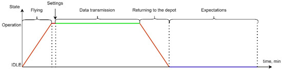 - Collective. This strategy involves delivering a group of UAVs to a designated LiFi point of the route using a UAV carrier. The network deployment time criterion can determine the arrival point of the UAV group. These strategies are more complex since an additional entity—a carrier UAV—is introduced into the traffic rules and obstacle avoidance algorithms. However, its use saves the battery resource of each UAV and ensures longer operation of the LiFi network in one deployment.