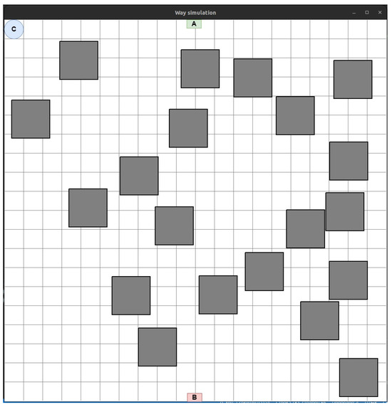 Stage 1. Laying the LiFi signal propagation route in conditions of interference. In the simplest version, the task can be formulated as follows: laying a route (LiFi communication line) from point A (source of information) to point B (consumer of information) in a production facility with obstacles in two-dimensional (2D) space is needed. Although the use of 2D space may limit flexibility in choosing optimal routes, especially in the face of changing environments or navigation accuracy requirements, 2D modelling is also desirable for the following reasons:
