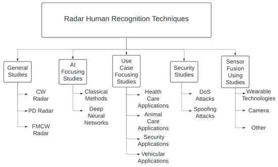 This study evaluated the general state of radar-based human detection technology, related literature, and state-of-the-art methods. This study aimed to provide guidelines for new research in this area. Therefore, this study provides a general overview of the relevant literature, provides the reader with a general taxonomy of the literature, as shown in Figure 1, and highlights the historical development of the literature. This paper is structured as follows: First is a General Studies Section 2, which consists mainly of earlier articles in the field, followed by a Radar Types Section 3, which gives a general overview of the research on the feasibility of different radar types. The AI-Focused Studies Section 4 relates to AI techniques. The fourth section is about Use Case-Focused Studies, Section 5, which is grouped into physical security applications, the healthcare industry, nature, animal care applications, and automotive industry applications. The sixth section discusses Security Studies, Section 6, including DoS and spoofing attacks. The subsequent section is concerned with sensor fusion techniques, Section 7. In this section, we discuss the details of the sensor fusion techniques applied to micro-Doppler radars. The final section is reserved for Suggestions and redirects the reader to Section 8, discussing our suggestions for extending the literature on this subject.