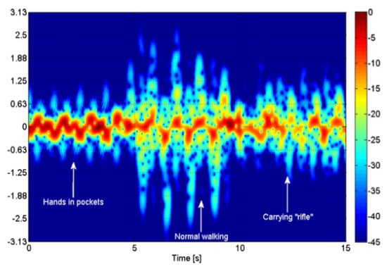 Spectogram analysis of persons walking hands in pocket, normal walking and carrying rifle [19].