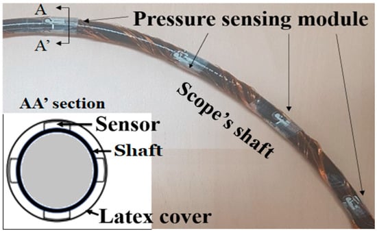 Each pressure sensing module consists of four pressure sensors. The six sensing modules were attached at 10 cm intervals along the scope shaft. The four sensors in each module were arranged at 90-degree intervals along the circumference of the shaft cross-section, as presented in Figure 1. Each sensor was first glued to the shaft surface using a biocompatible adhesive. Each sensor was connected to an external circuit via a very thin, enamel-coated signal wire. The scope shaft with the sensor and signal wires was wrapped and packaged in a latex cover for waterproofing and hygiene. The thickness of the sensor was 0.203 mm, the diameter of the enamel wire was less than 0.2 mm, and the thickness of the latex film was less than 0.1 mm. Therefore, the surrounding of the outer surface of the shaft had little effect on the flexibility or bendability of the colonoscope. The gastroenterologist who handled the proposed device gave a similar opinion. This is also confirmed in a previous study by Vajpeyi et al. [].
