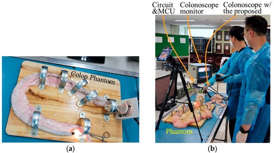 A series of simulated colonoscopic insertions was conducted on an intestinal tract phantom using a fresh swine colon by physicians and engineers to demonstrate the device’s effectiveness. Both a general colonoscope and the proposed device were applied. The tract phantom was shaped to mimic the sigmoid and hepatic curvature of the human colon. The experts who participated in the experiment evaluated that the device was properly built and posed no significant inconvenience in use.