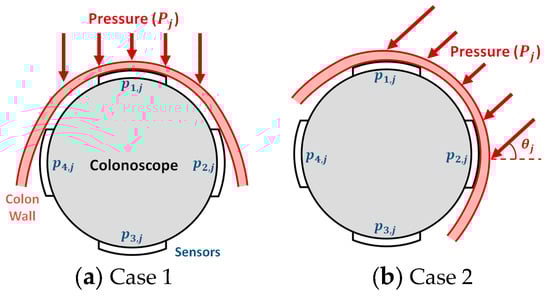 For the signal processing, the largest value (pmax1,j) and the next-largest value (pmax2,j) were classified among the four pressures for each the pressure sensing modules, as shown in Figure 5. This shows a cross-section of the gray scope shaft and the pink colon wall. The module pressure (Pj) can be determined using the fact that the pressure sensor only detects pressure applied in the vertical direction. If one of the two values is significantly larger, it corresponds to case 1 in Figure 5a. In this case, the largest value (pmax1,j) is the module pressure (Pj). If the two values are similar, it corresponds to case 2 in Figure 5b. In this case, the module pressure (Pj), is calculated from the following relationship in Equations (1) and (2). This was derived from the fact that the module pressure (Pj) applied at the oblique angle (θj) is sensed only in the vertical direction by the two sensors in contact.