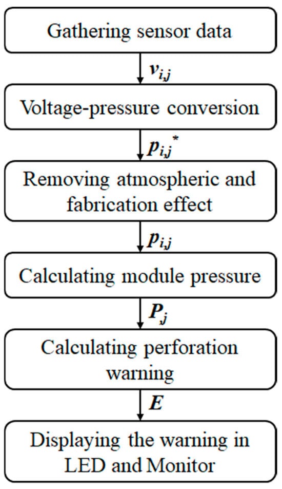 Signal processing; sensor voltage to perforation warning. pi,j* = sensor pressure before removing atmospheric and fabrication effect. (i = 1, 2, …4, j = 1, 2, …6).