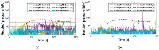 Module pressure of a novice with and without proposed device: (a) a novice’s module pressure without the device, (b) a novice’s module pressure without the device.